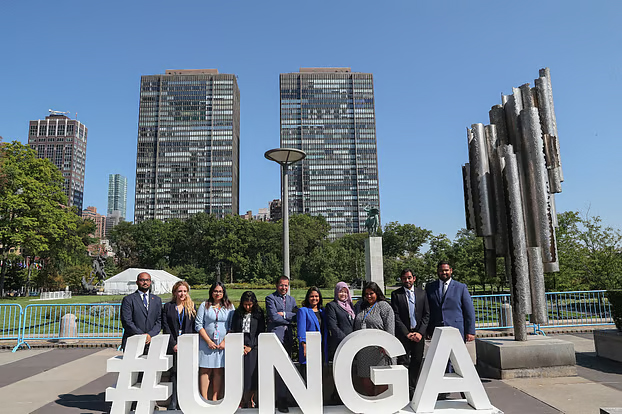 জাতিসংঘের সদর দপ্তরের সামনে অধিবেশন উপলক্ষে বিভিন্ন দেশের পতাকা উড়ছে