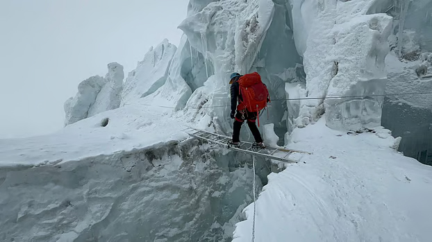 মই ব্যবহার করে ক্রিভাস পার হচ্ছেন এক পর্বতারোহী
