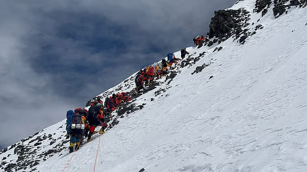 দড়ি ধরে একে একে চূড়ার দিকে যাচ্ছেন পর্বতারোহীরা