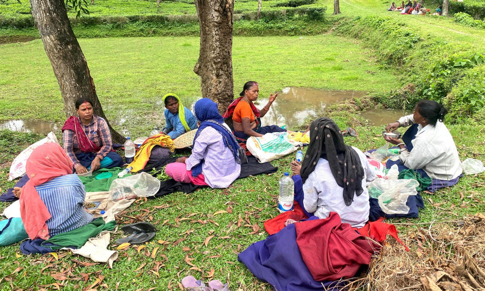 বাগানের অভ্যন্তরে কোনো যান্ত্রিক দূষণ বা শহুরে কোলাহল নেই। পিনপতন নিরবতা। তারই মাঝে বিশ্রাম নিচ্ছেন চা শ্রমিকরা