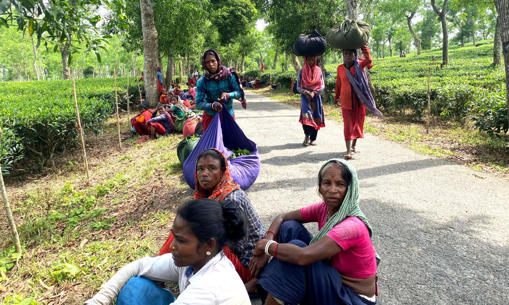 বাগান থেকে নিজেদের সংগ্রহ করা চা পাতা নিয়ে যাচ্ছেন শ্রমিকরা