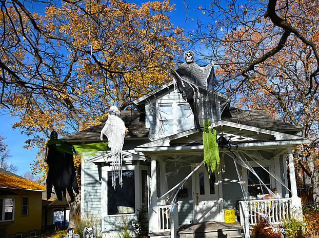 ঘরের সামনে জালের সাজ আর ঝুলন্ত ডাইনির পুতুল—