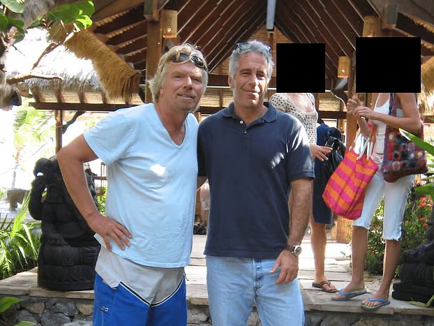 আংশিকভাবে মুছে দেওয়া একটি ছবিতে জেফরি এপস্টেইন (ডানে) ও ব্রিটিশ ধনকুবের রিচার্ড ব্র্যানসন।