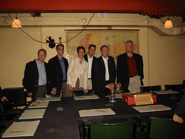 গিলেন ম্যাক্সওয়েল, বিল ক্লিনটন ও জনপ্রিয় ব্রিটিশ সংগীতশিল্পী মিক জ্যাগার (ডান থেকে)।