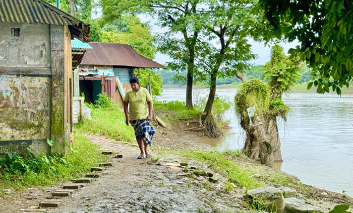 কুশিয়ারা নদীর ভাঙনের কবলে দোকানপাট মসজিদ মাদ্রাসাসহ বসতবাড়ি। ছবিটি সিলেটের বিয়ানীবাজারের ফাড়িরবাজার এলাকা