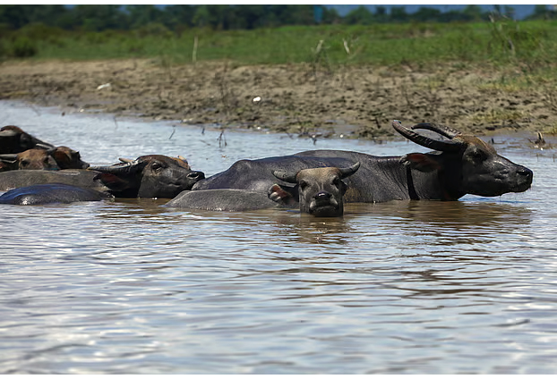 জলাশয়ে শরীর ডুবিয়ে আছে একপাল মহিষ