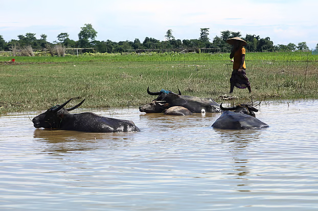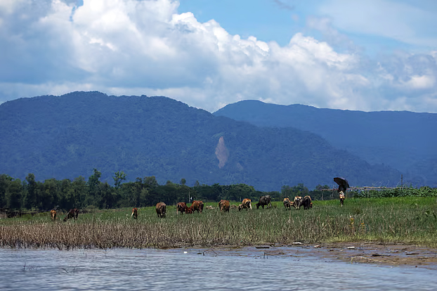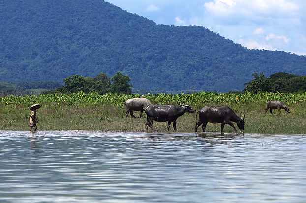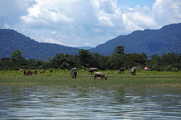 টিলা আর জলাশয়ের মাঝখানে তৃণভূমিতে চড়ে বেড়াচ্ছে মহিষ