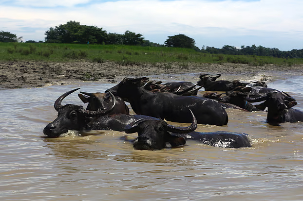 তপ্ত দুপুরে জলাশয়ে কয়েকটি মহিষ