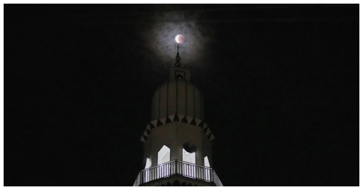 পাকিস্তানের রাওয়ালপিন্ডিতে একটি মসজিদের মিনারের ওপর থেকে আংশিক চন্দ্রগ্রহণের ছবি
