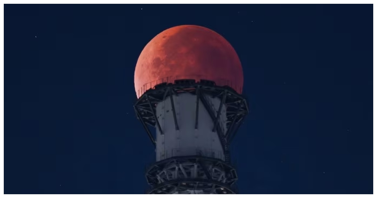 টোকিও স্কাইট্রি টাওয়ারের ওপরে রক্তিম চাঁদ।