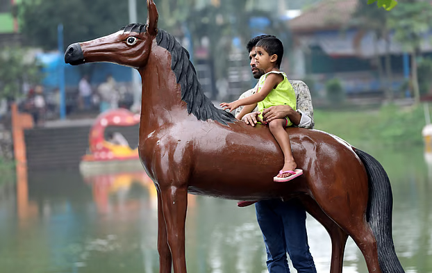 কৃত্রিম ঘোড়ায় শিশুকে বসিয়ে আনন্দিত এক অভিভাবক।