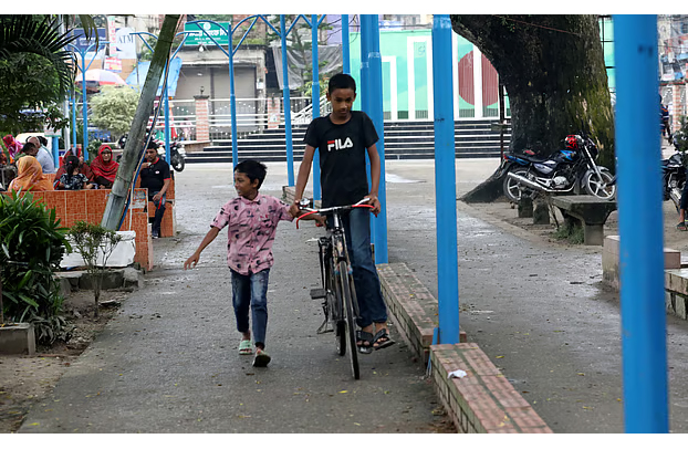 সাইকেলে চেপে অভিভাবকের সঙ্গে পার্কে এসেছে দুই শিশু।