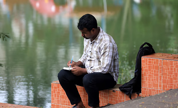 পার্কে বসে নিজের বেচাবিক্রির হিসাব মিলিয়ে নিচ্ছেন এক বিক্রয়কর্মী।