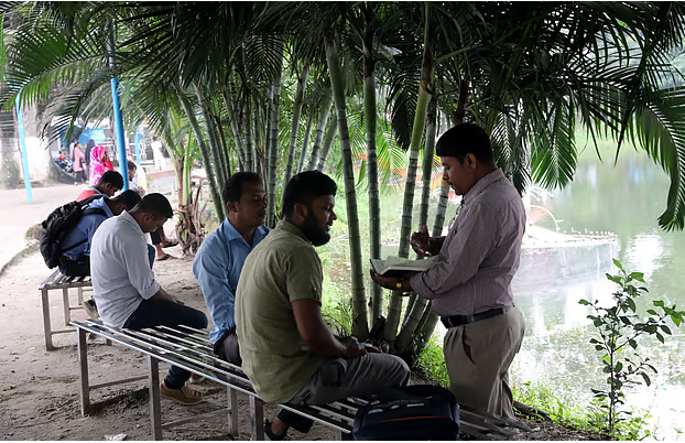 শানবাঁধানো পুকুরপাড়ে বসে গল্পে মেতেছে শিক্ষার্থীরা।